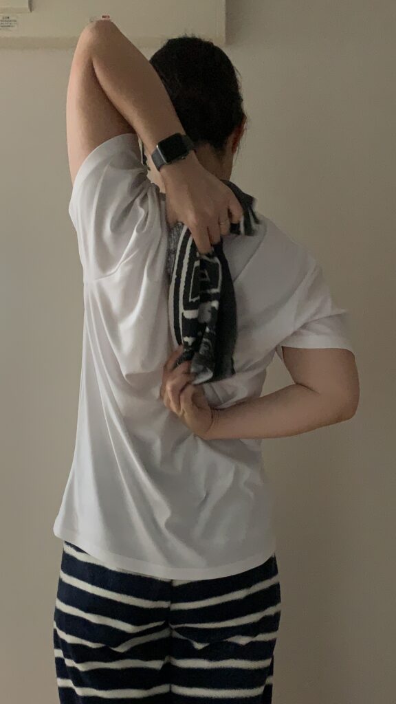 そんな時は、以下写真のストレッチを2セットやるだけでも、ちょっとだけ背中がポカポカします。